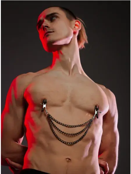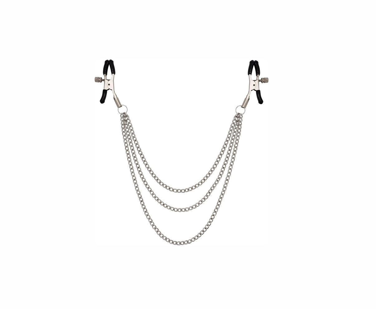Классические зажимы для сосков, соединенные цепочкой, позволяет создать нужный уровень давления на сосок, а также — играть, потягивая за цепочку, давая ее в рот подопечной или прикрепляя к чему-то.